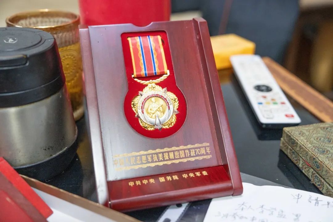 老爺爺?shù)睦习橄蛭覀冋故玖怂臉s譽勛章和一些資料,其中有中國人民志愿軍抗美援朝出國作戰(zhàn)70周年紀(jì)念章,由中共中央、國務(wù)院、中央軍委聯(lián)合頒發(fā)。從老奶奶展示的資料中我們了解到老爺爺是1939年11月21日出生,在1956年3月參加中國人民志愿軍到朝鮮,部隊是297部隊13小隊,部隊所在地是朝鮮大陽里,戰(zhàn)爭結(jié)束后轉(zhuǎn)入中國人民解放軍沈陽部隊,部隊番號是0854部隊,部隊所在地是沈陽。老爺爺在朝鮮大陽里,隨部隊參加了朝鮮戰(zhàn)爭,完成了運輸武器、彈藥等工作,回國后隨沈陽部隊參加了保衛(wèi)祖國的重要任務(wù)。